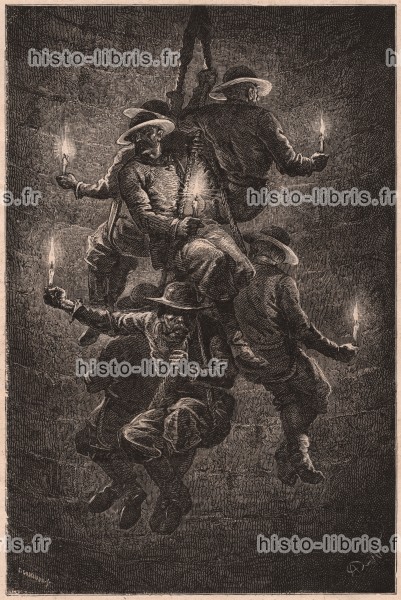 Un groupe de six mineurs est descendu dans un puits de la mine de sel de Wielliczka (Pologne). Les mineurs, accrochés à des cordages, tentent de percer la pénombre à l'aide de bougies.